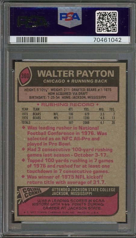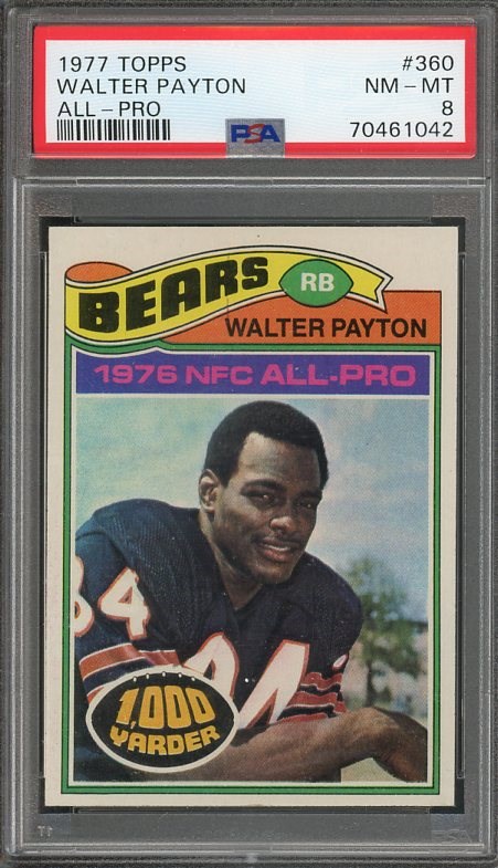 1977 Topps Walter Payton #360 PSA NM/MT 8 - This is Payton's second year issue and it looks great. A solid PSA NM/MT 8 in a scratch free PSA holder.