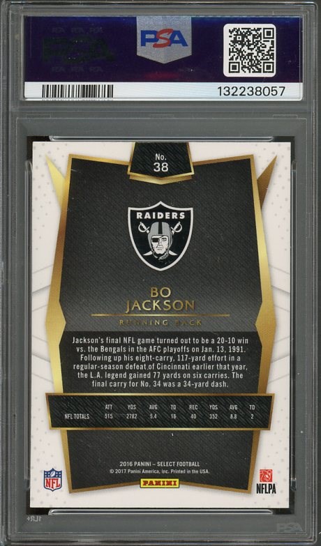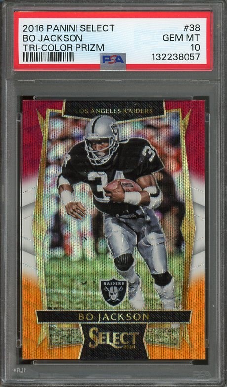 2016 Panini Select Bo Jackson Tri-Color Prizm #38 PSA GEM MINT 10 - This card looks amazing with a great design and color scheme. This Jackson Tri-Color Prizm was recently graded PSA 10 and comes in a new holder.