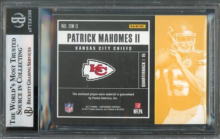 2017 Contenders Patrick Mahomes Rookie Ticket Swatches Horizontal Green #3 BGS 8.5 - This card was issued in both a vertical and horizontal design. This horizontal version is the more limited green parallel and is graded NM/MT 8.5 by BGS.