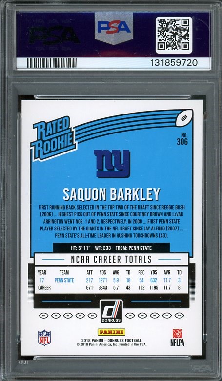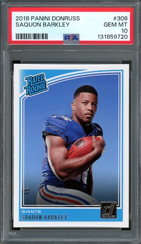 2018 Panini Donruss Saquon Barkley RC #306 PSA GEM MINT 10 - A great card and what you would expect from one with a PSA Gem Mint 10 grade. Holder is scratch free.