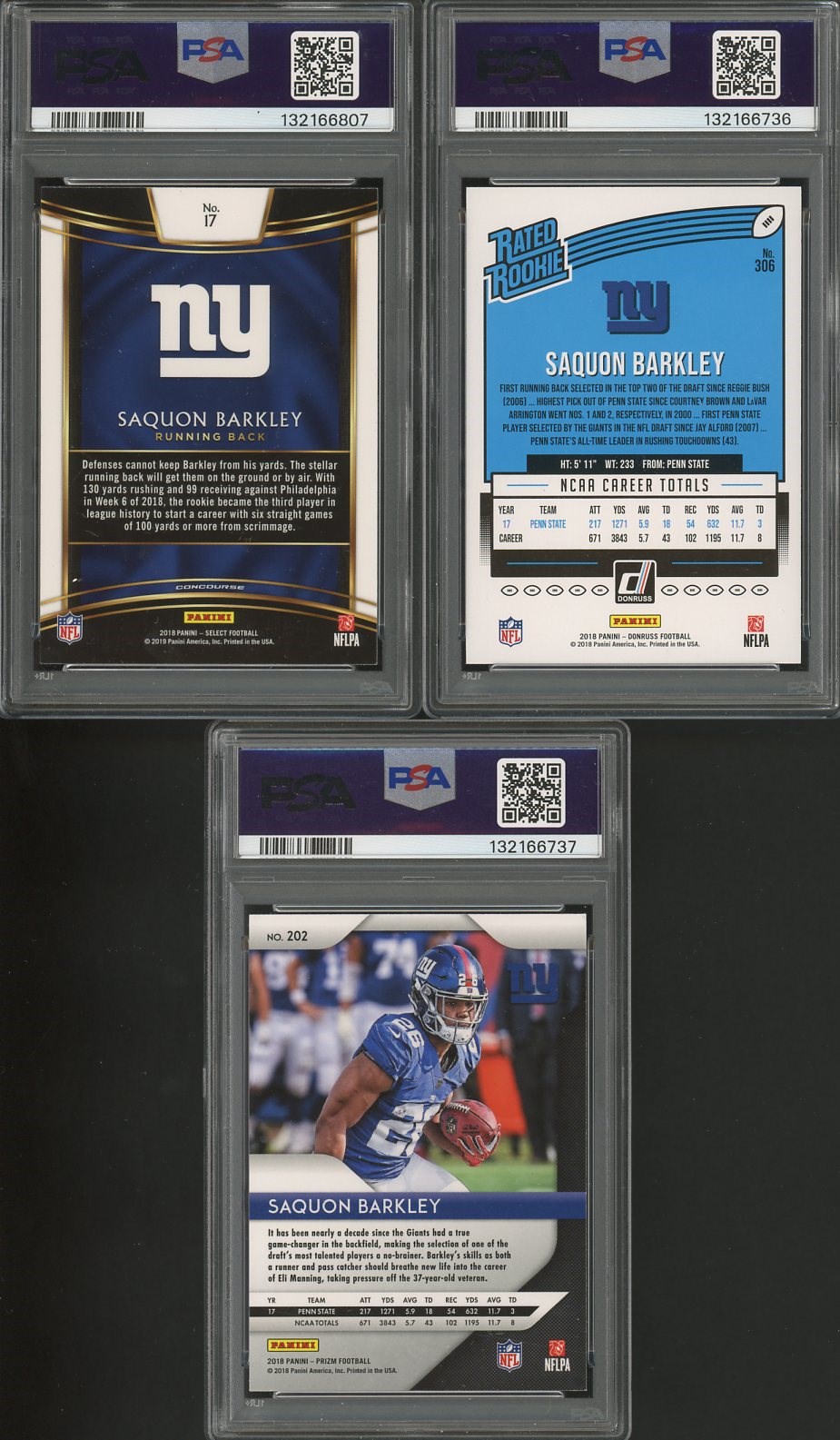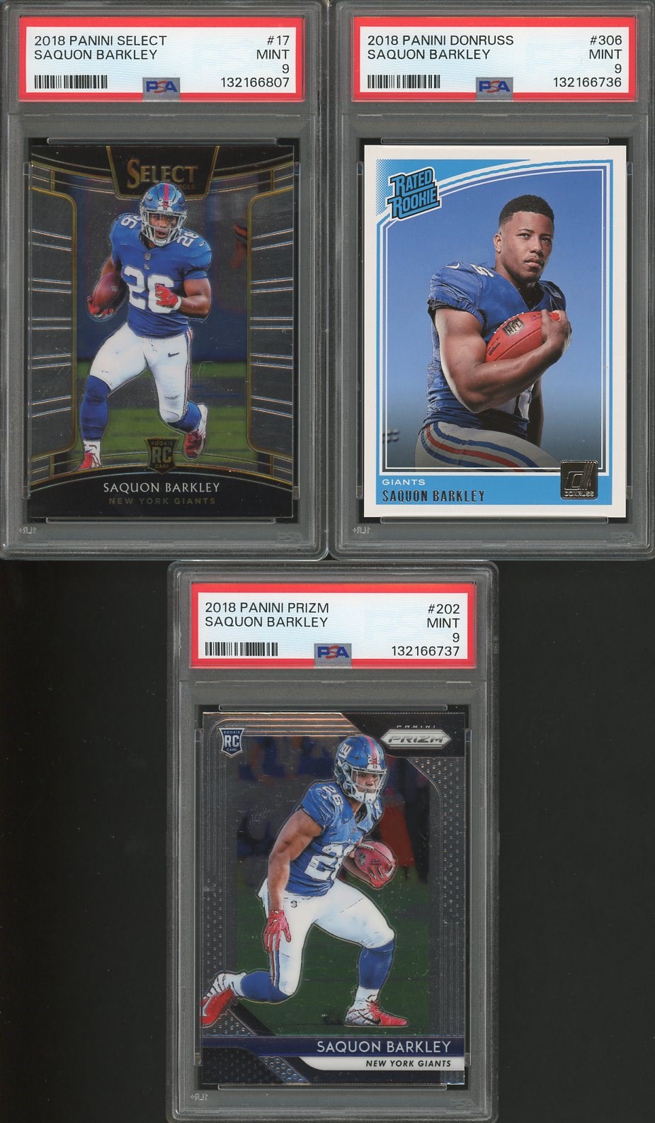 Lot of 3 Different Saquon Barkley 2018 Rookies All are PSA MINT 9's - Three great brands (Prizm, Donruss & Select) of Barkley rookies make up this lot. All three cards are graded Mint 9 by PSA.