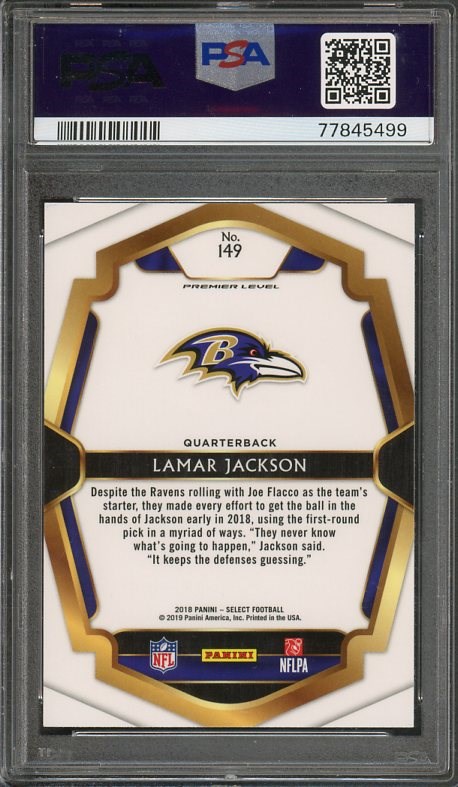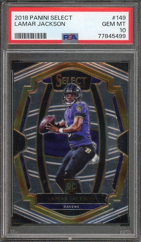 2018 Panini Select Lamar Jackson RC #149 PSA GEM MINT 10 - A great rookie to own and in Gem Mint condition. Card comes in a scratch free holder.