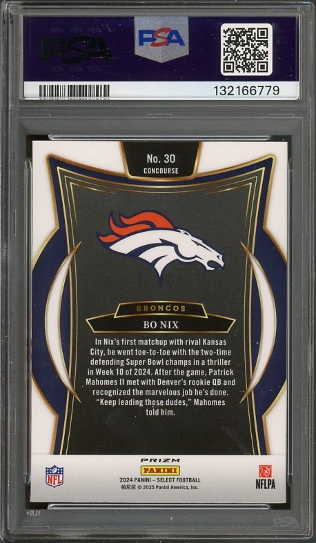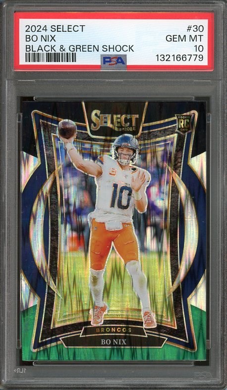 2024 Panini Select Bo Nix Black/Green Shock Prizm RC #30  PSA GEM MINT 10 - Nix emerged as a top tier QB in 2025 leading the Broncos to the AFC Championship game. Here is a clean PSA 10.