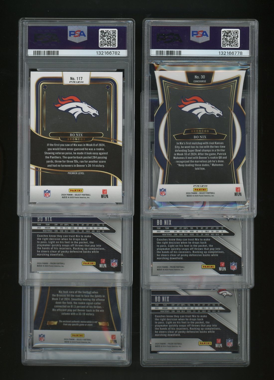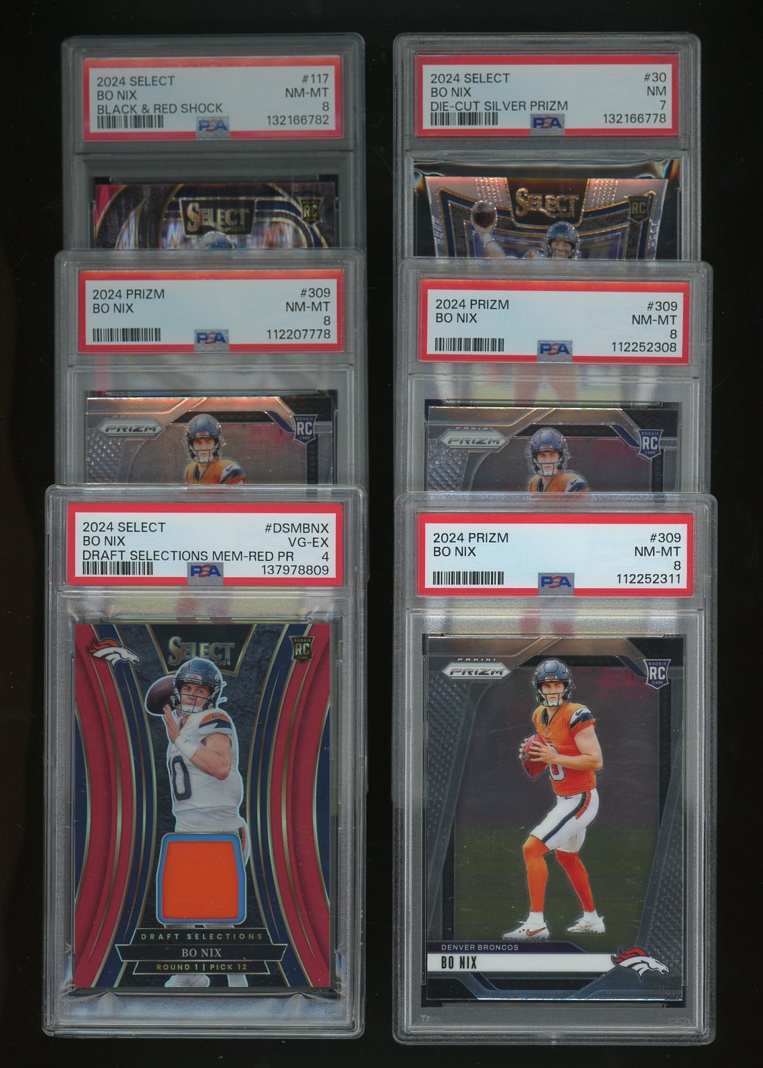 Lot of 6 Bo Nix 2024 Rookies All PSA Graded - For the collector, here are six rookie cards from Panini Prizm or Select of Bo Nix.  Starting bid is just $5.00 per card!!!
