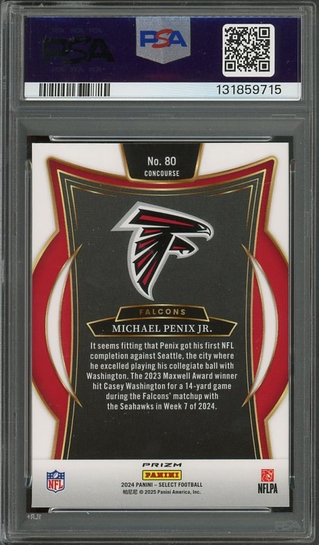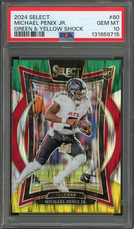 2024 Panini Select Michael Penix, Jr. Green & Yellow Shock Prizm RC #80 PSA GEM MINT 10 - A colorful card of Michael Penix, Jr., this Green and Yellow Shock card comes from the 2024 Select product.
