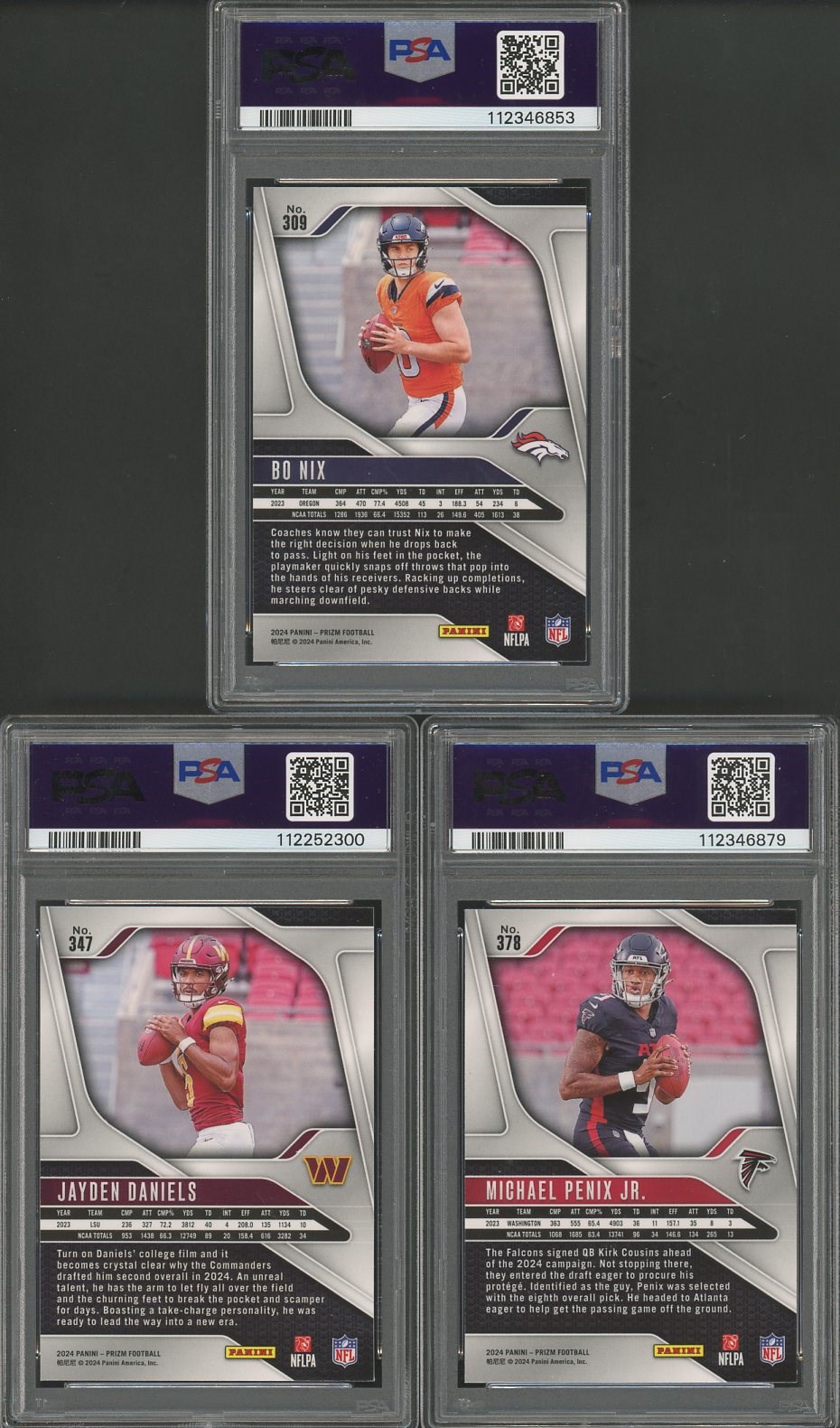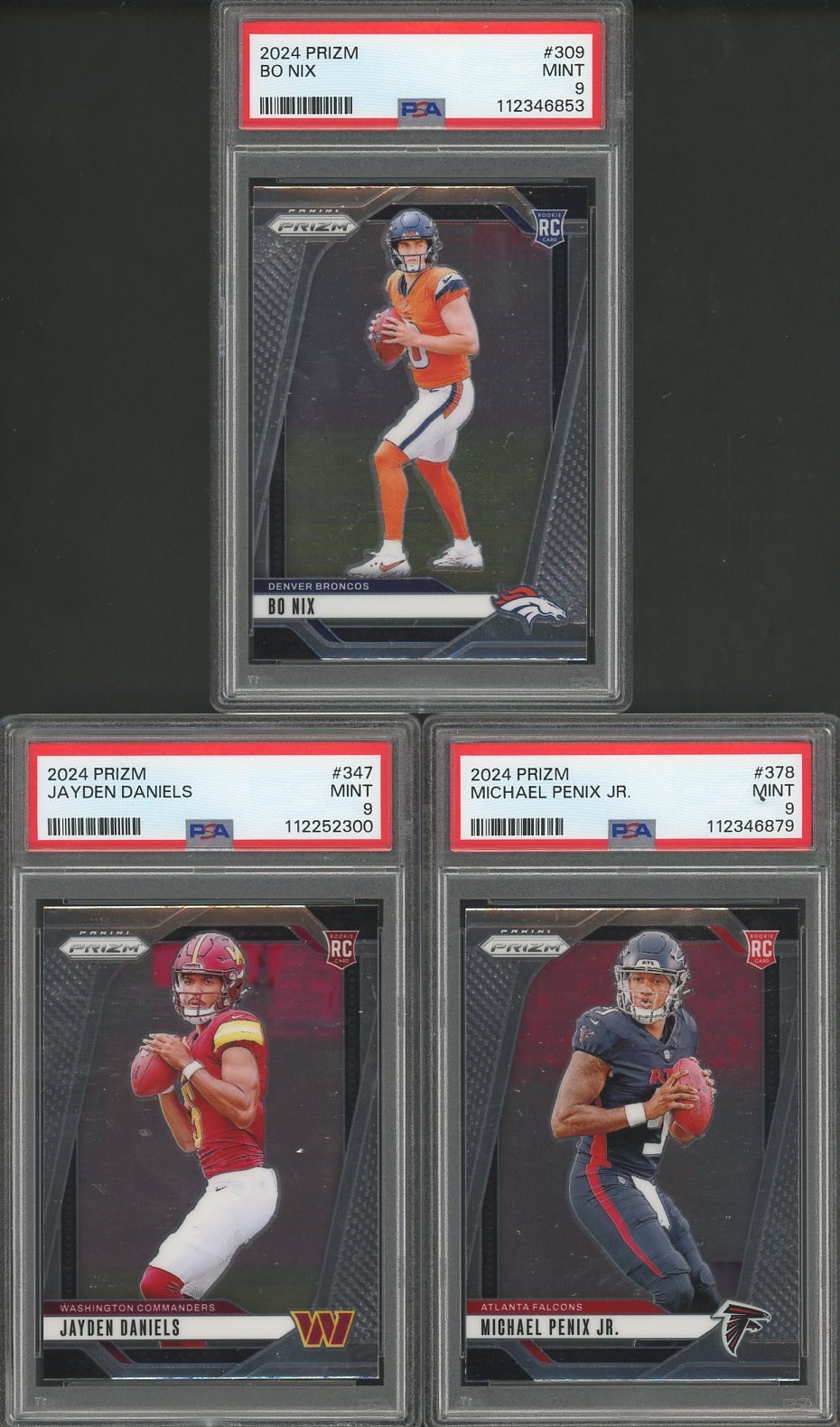 2024 Panini Prizm RC's of Jayden Daniels, Bo Nix & Michael Penix All PSA MINT 9's - Here are the Prizm rookies of three quarterback talents. All three are graded Mint 9 by PSA.