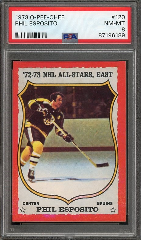 1973 O-Pee-Chee Phil Esposito #120  PSA NM/MT 8 - Esposito became the first player to score more than 100 points in a season, with 126 in 1968–69, a feat he achieved a further five times.  Here is a high grade 1973 O-Pee-Chee for your consideration.