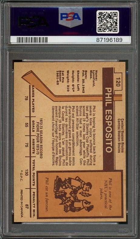Lot # 952: 1973 O-Pee-Chee Phil Esposito #120 PSA NM/MT 8