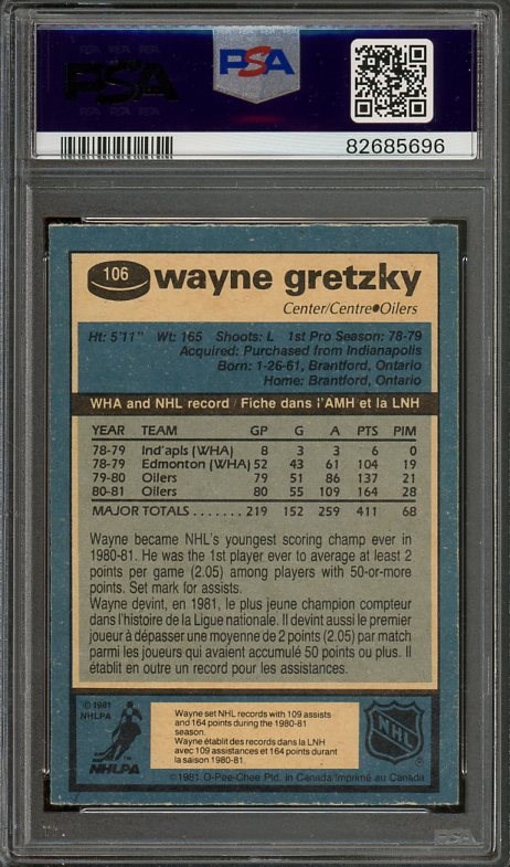 1981 O-Pee-Chee Wayne Gretzky #106  PSA EX/MT 6 - O-Pee-Chee production was less than the Topps version, making this early Gretzky card desirable in any grade. A clean card.