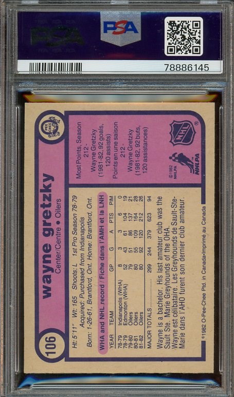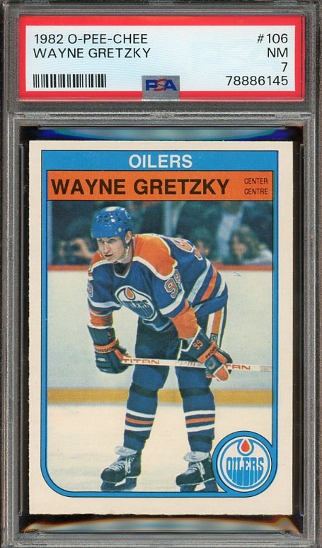 1982 O-Pee-Chee Wayne Gretzky #106 PSA NM 7 - Similar to Jordan and Griffey Jr., the Gretzky cards have been on the move recently, with investors stocking up. Grab this PSA 7 before it is gone!