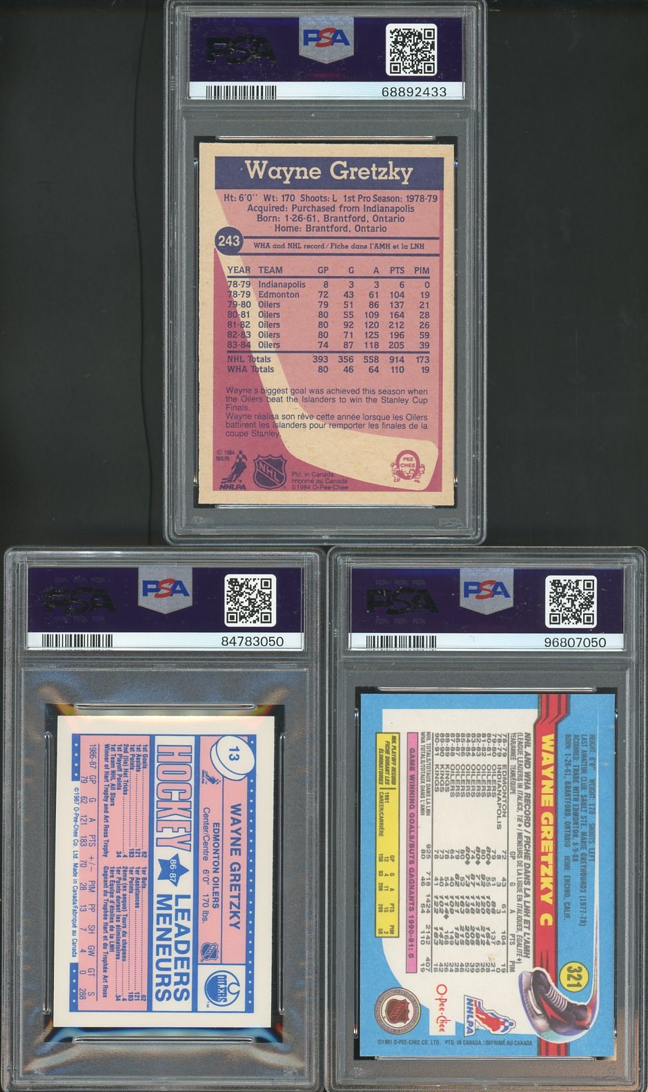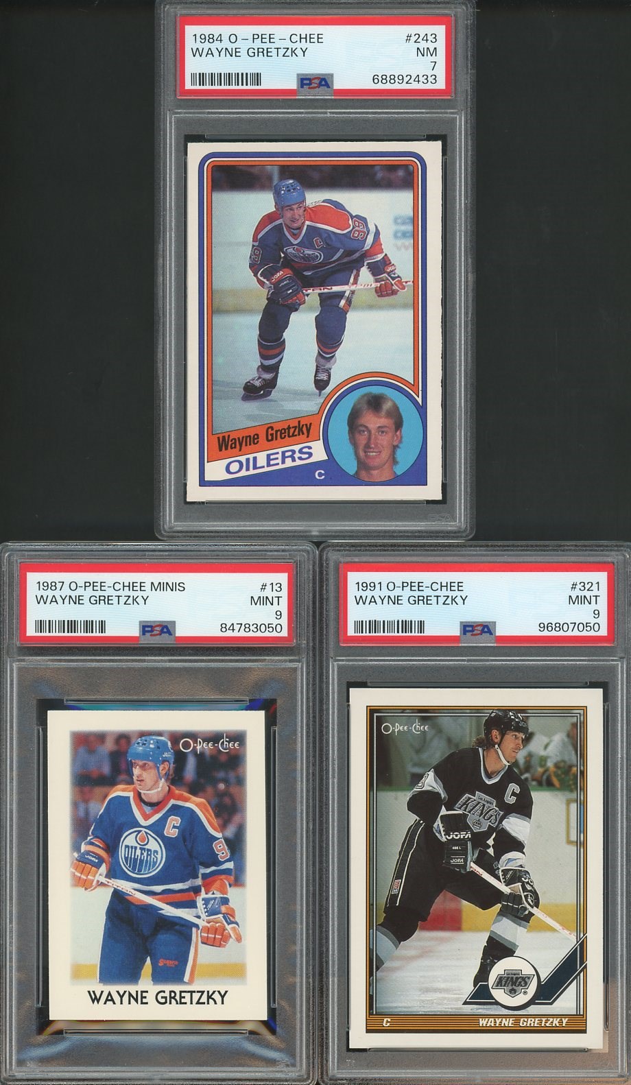 Lot of 3 Different Wayne Gretzky O-Pee-Chee Cards All PSA Graded - All OPC, this lot includes his 1984 #243 PSA 7, 1987 #13 PSA 9, and 1991 #321 PSA 9.