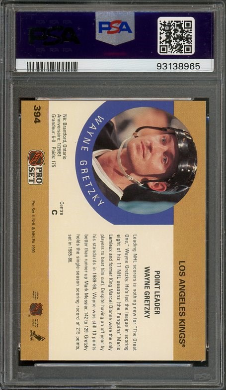 1990 Pro Set Wayne Gretzky #394  PSA GEM MINT 10 - The 1990 Pro Set cards were a bit condition sensitive, especially on the back.  Here is a Gem Mint 10 of the "Great One" Wayne Gretzky.  Card comes in a scratch free PSA holder.