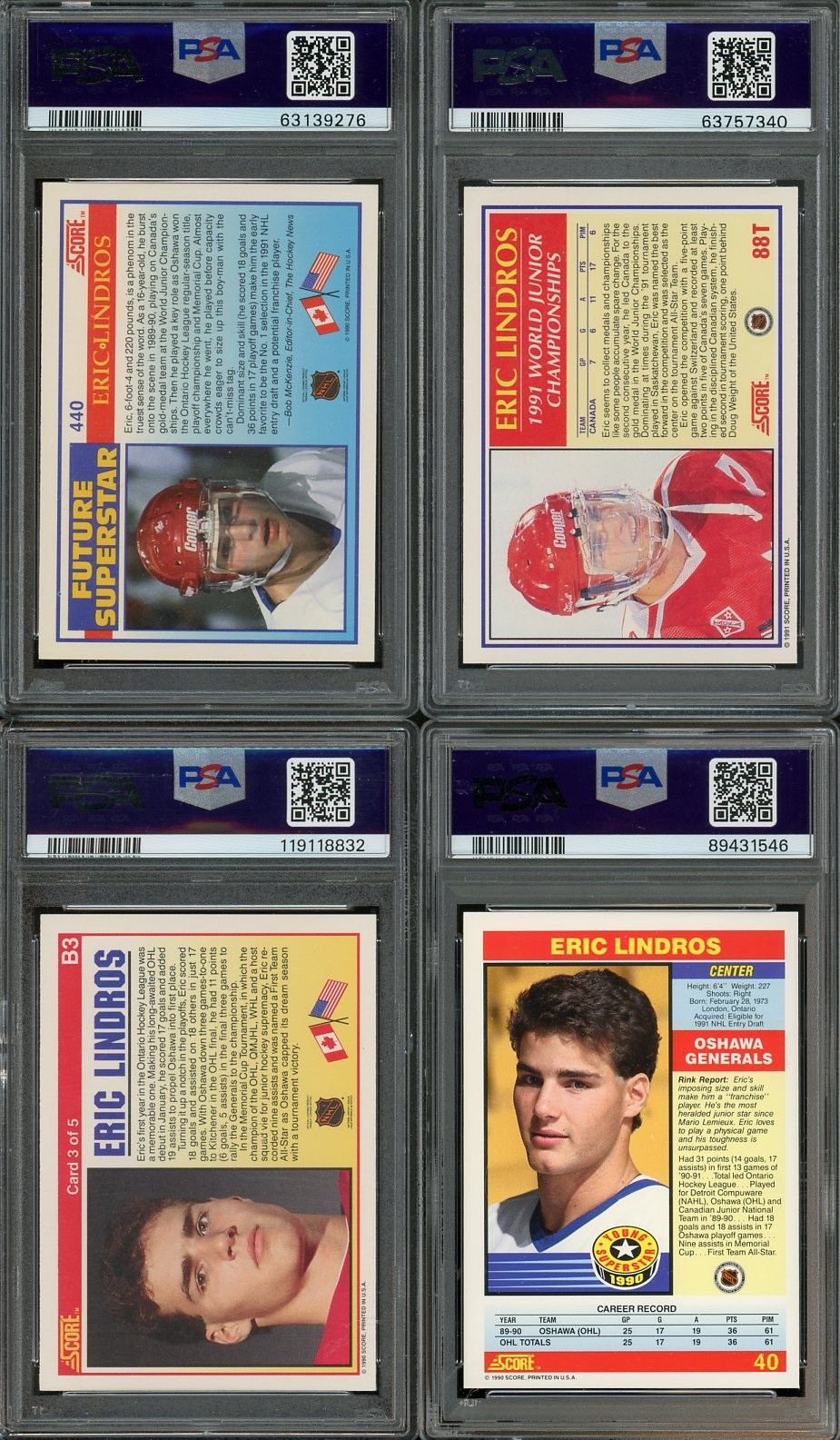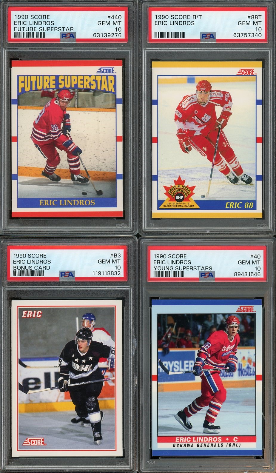 Eric Lindros 1990 Score Lot of 4 Different PSA GEM MINT 10's - Here is a great selection of Lindros cards all from his rookie season. Lot includes his Score base rookie #440, Rookie/Traded #88T, Bonus Card #B3, and Young Superstars #40. All are PSA 10's.