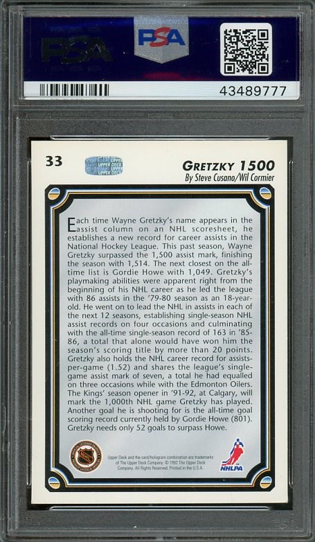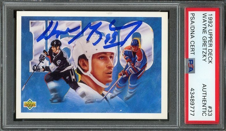1992 Upper Deck Wayne Gretzky #33 Autographed PSA/DNA Authentic - A super high quality signature by Gretzky spanning two thirds of the card. The bold blue sharpie autograph is authenticated by PSA/DNA. A real quality item to own!