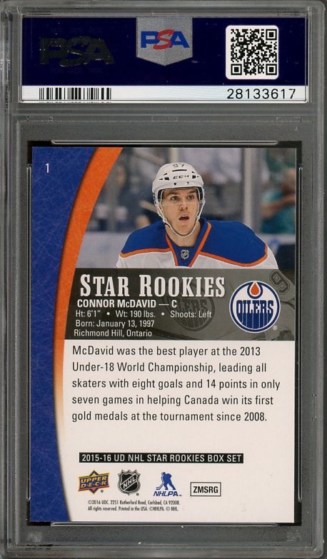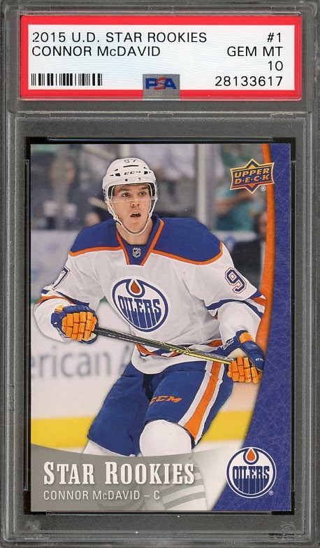 2015 Upper Deck Star Rookies Connor McDavid #1  PSA GEM Mint 10 - With McDavid's "Young Guns" rookie out of the price range of most collectors, this "Star Rookie" from Upper Deck provides an affordable alternative.