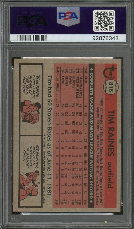 1981 Topps Traded Tim Raines RC #816  PSA Mint 9