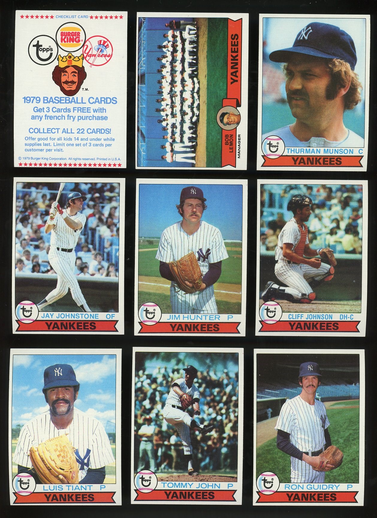 1979 Topps Burger King Yankees Complete 23 Card Set - Set is EX/MT to NM and includes all of the big Yankees stars.