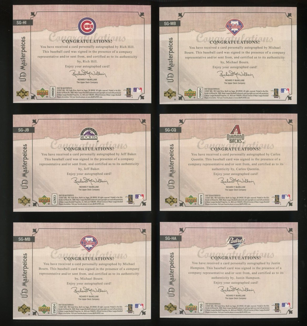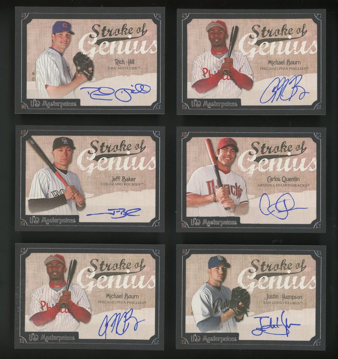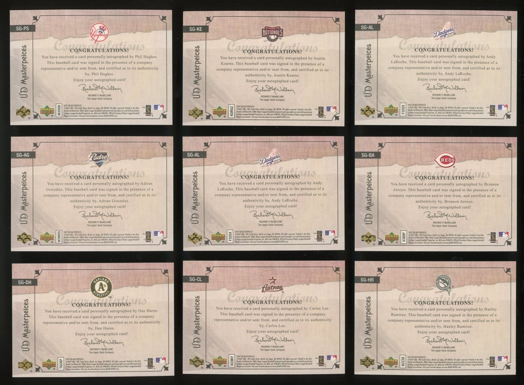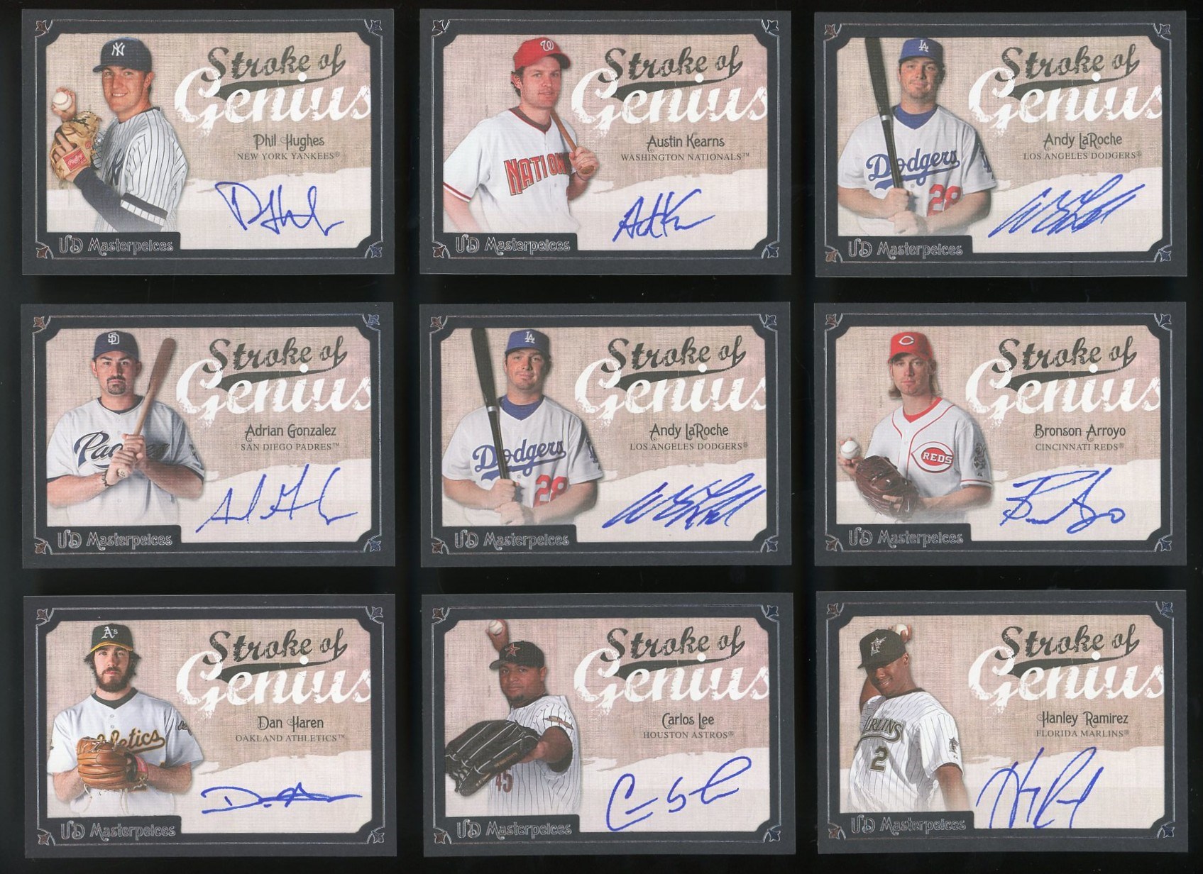 Lot of 15 2007 Upper Deck Masterpieces Strokes of Genius Autographs (2 duplicates) - Starting bid is just $2 per card! Phil Hughes, Austin Kearns, Adrian Gonzalez, Bronson Aroyo, Carlos Lee, Hanley Ramirez, Carlos Quentin and more. There are a couple of duplicates and cards are NM/MT?to Mint.