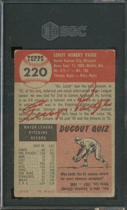 1953 Topps Satchel Paige #220 SGC VG 3 - An attractive card with great centering. Card has corner wear but no creases and is graded VG 3 by SGC. A quality card with nice eye appeal.
