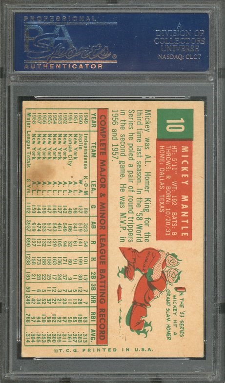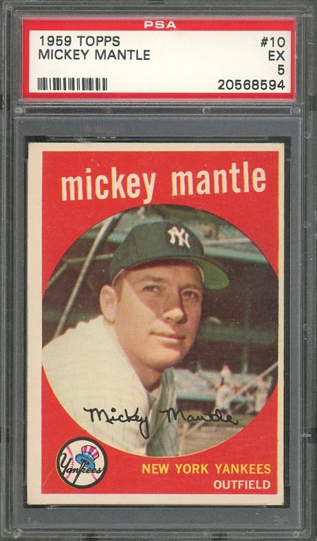 1959 Topps Mickey Mantle #10 PSA EX 5 - Up for auction is a mid grade Mantle from the 1959 set. Strong corners and color stand out on this PSA 5. Card comes in a scratch free PSA holder.