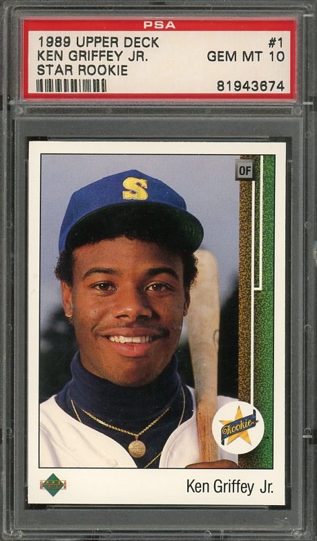 1989 Upper Deck Ken Griffey, Jr. RC #1  PSA GEM MINT 10 - Here is the iconic Ken Griffey, Jr. 1989 Upper Deck rookie card.  Gem Mint 10's have really been hot in the last year as investors have taken a lot of them out of circulation.