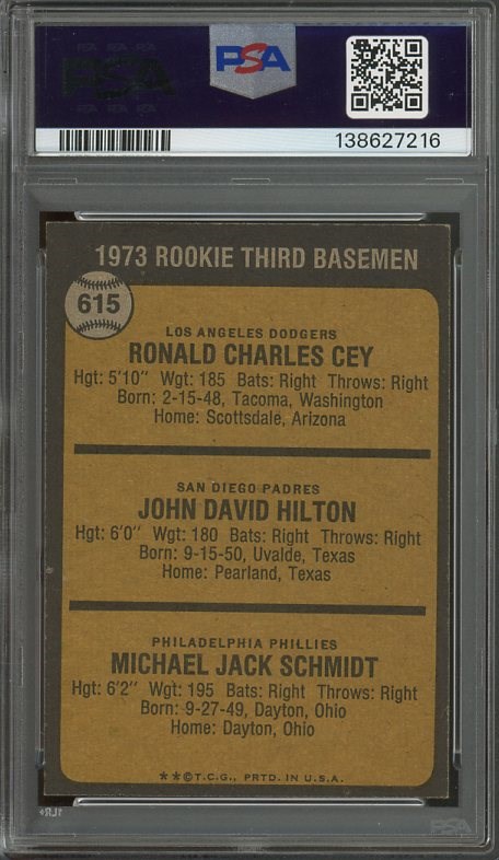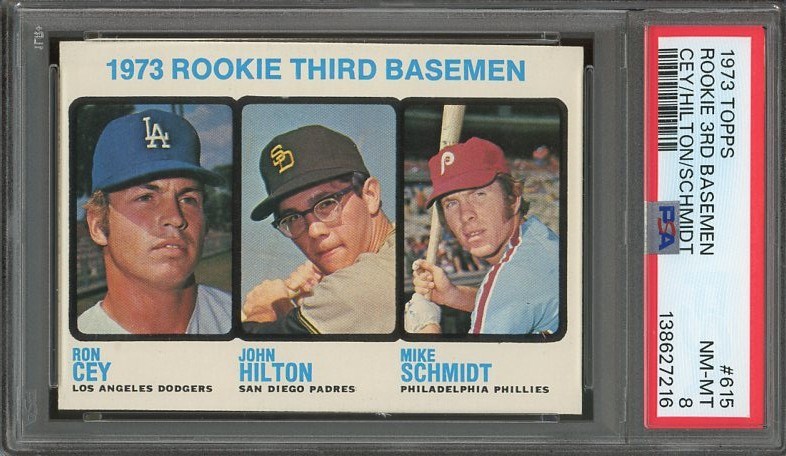 1973 Topps Mike Schmidt RC #615 PSA NM/MT 8 - Five years ago this card was not that tough to find, but today, high grade Schmidt rookies are tough to come by. 1973 was the last year that Topps came out in different series, with this Schmidt card featured in the tough high series.
