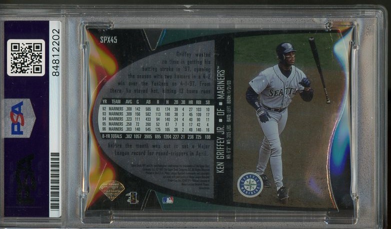 1997 SPX Ken Griffey, Jr. Die-Cut #45 Autographed with PSA 10 Auto Grade - This is such a great card, we almost made it one of the auction's featured items. A great looking signature on a great SPX Griffey card. PSA authenticated the autograph and gave it a Gem Mint 10 grade.