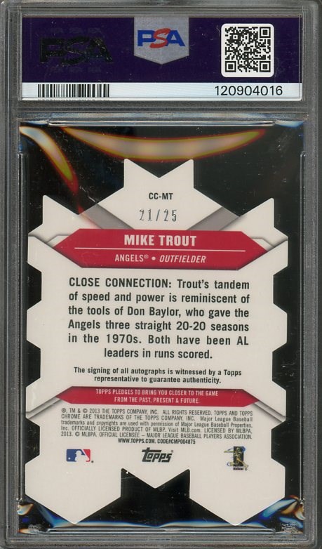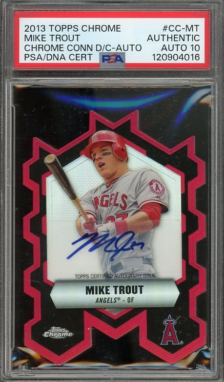 2013 Topps Chrome Mike Trout Chrome Connection Die-Cut Autograph #CC-MT (#'d/25) with PSA 10 Auto - We have a lot of great autographed cards in this auction, but this is one of our favorites. A great design with a flawless signature.