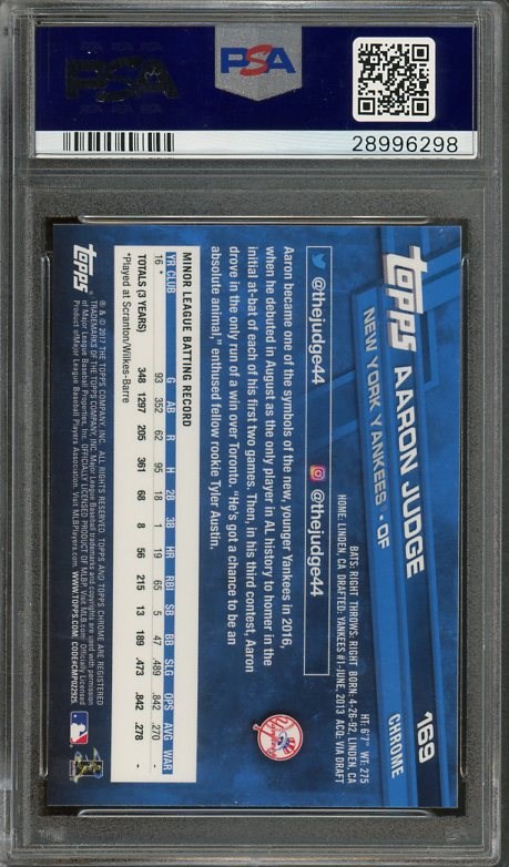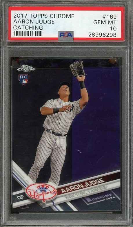 2017 Topps Chrome Aaron Judge RC #169 (Catching) PSA GEM MINT 10 - The Topps Chrome rookie has been among his most sought after rookies from 2017. Here is a PSA Gem Mint 10.