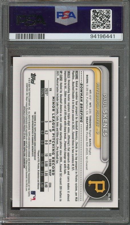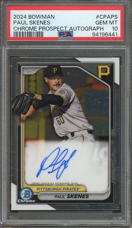 2024 Bowman Chrome Prospects Paul Skenes Autograph RC #CPAPS PSA GEM MINT 10 - Here is one of Skenes very best cards, the 2024 Bowman Chrome Prospects Certified Autograph and it is graded a PSA Gem Mint 10!