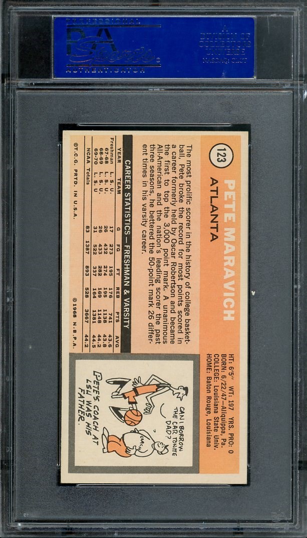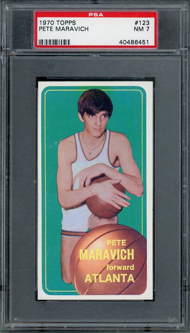 1970 Topps Pete Maravich RC #123 PSA NM 7 - Sharp corners and no print defects highlight this Maravich rookie. High grade examples have been red hot in the market, so act now if you want one in your collection.