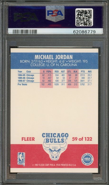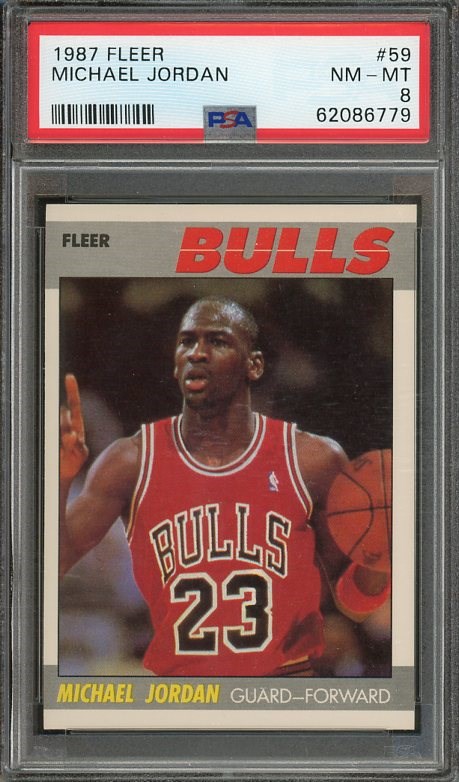 1987 Fleer Michael Jordan #59 PSA NM/MT 8 - Here is Jordan's second year issue by Fleer. Strong momentum on Jordan cards doesn't seem to be slowing down, so this may be your last chance at a PSA 8 in this price range.