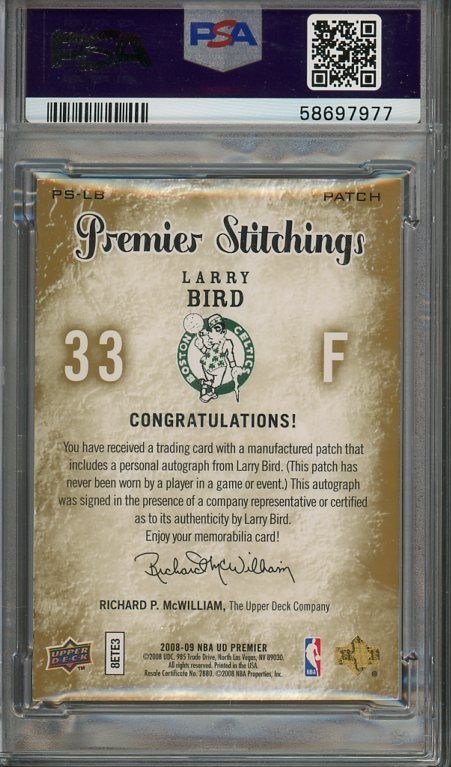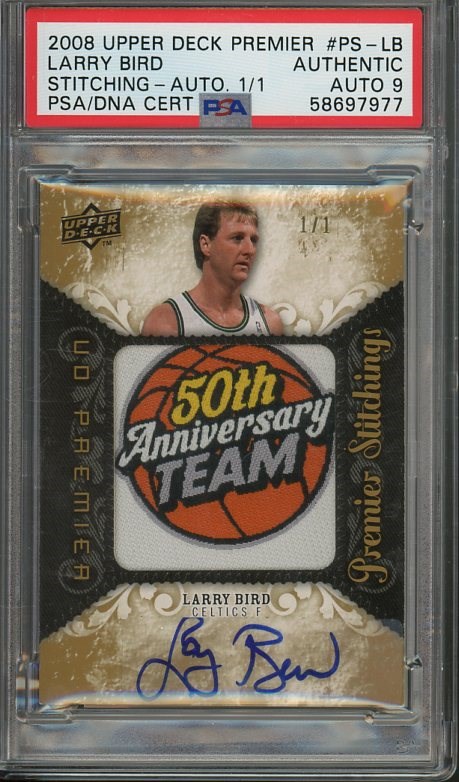 Lot # 44: 2008 Upper Deck Premier Larry Bird Stitching Autograph (1 of 1) with PSA Mint 9 Auto Grade