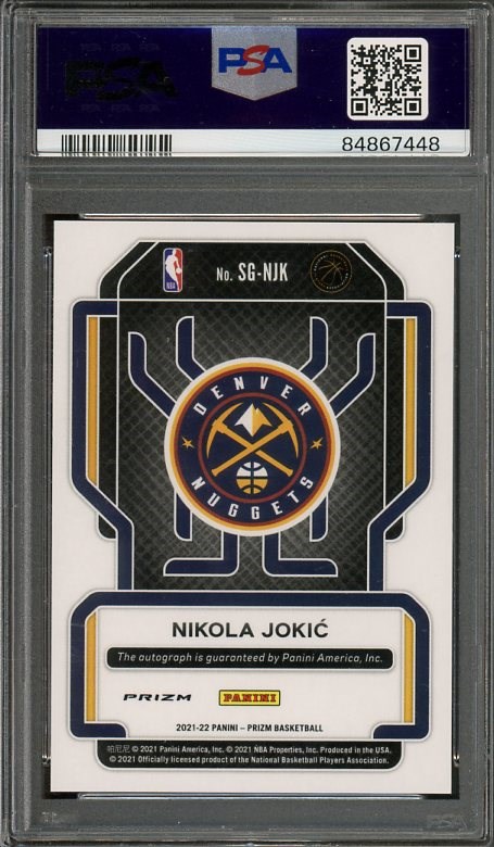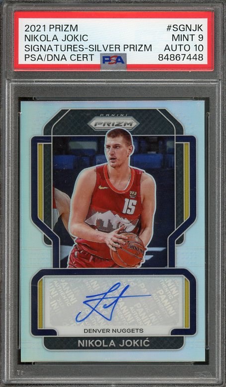 2021 Panini Prizm Nikola Jokic Signatures Silver Prizm #SGNJK PSA 9 with PSA 10 Auto - It seems like Jokic is in the conversation of league MVP nearly every year.  Here is a certified autograph of him from the 2021 Panini Prizm issue.