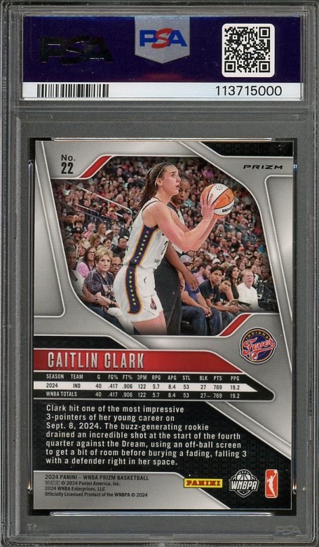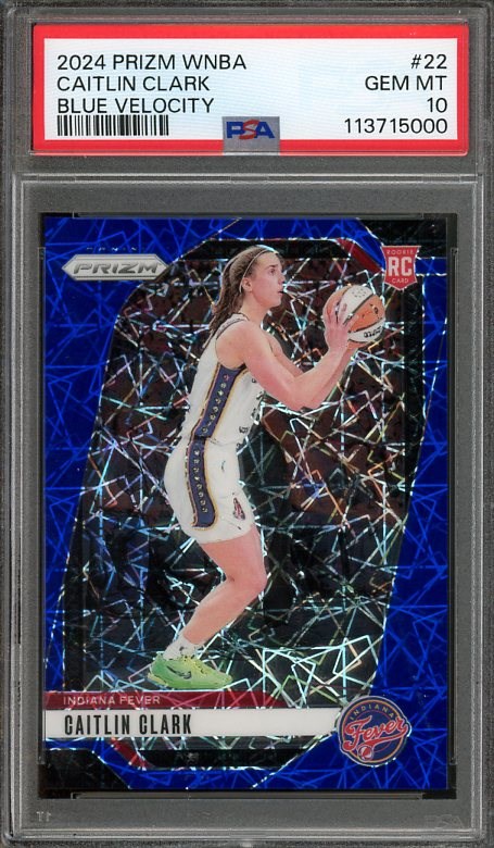 2024 Panini Prizm WNBA Caitlin Clark Blue Velocity RC #22 PSA GEM MINT 10 - Get excited about this one! Here is a great looking, limited rookie of Clark in PSA Gem Mint 10 condition. A must have card for the Clark collector.