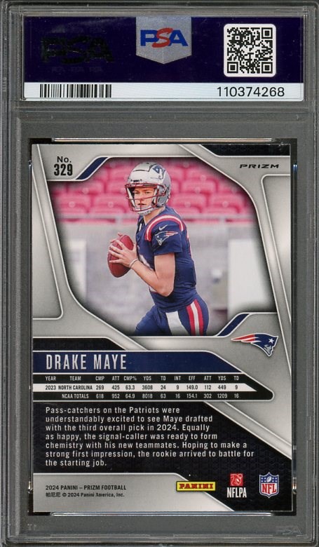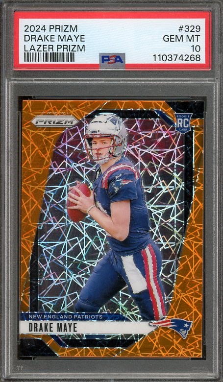 2024 Panini Prizm Drake Maye Lazer Prizm RC #329 PSA GEM MINT 10 - One of the hottest rookie cards in 2025, this Drake Maye Prizm is the Lazer Prizm parallel. A great looking card, especially in a PSA 10 holder.