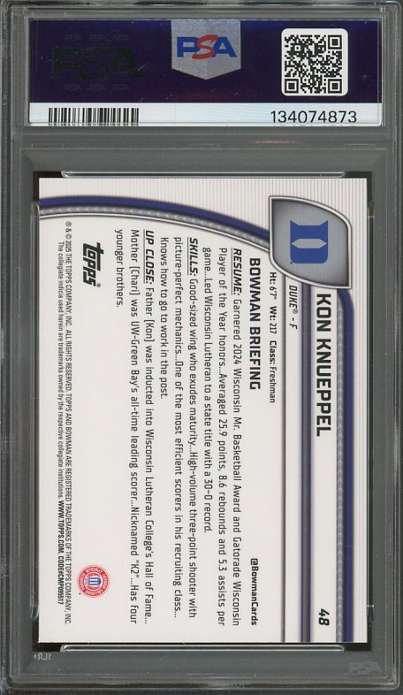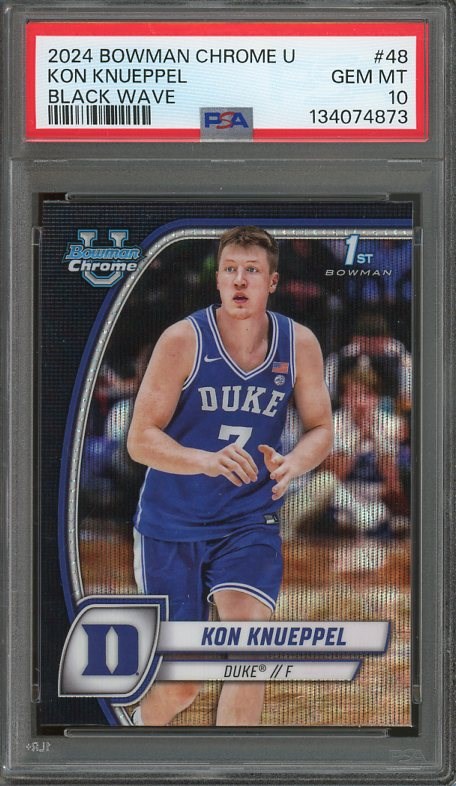 2024 Bowman U Chrome Kon Knueppel Black Wave Refractor RC #48 PSA GEM MINT 10 - Knueppel has taken the NBA by storm, becoming the fastest NBA player to make 200 career three point shots in just 58 games.