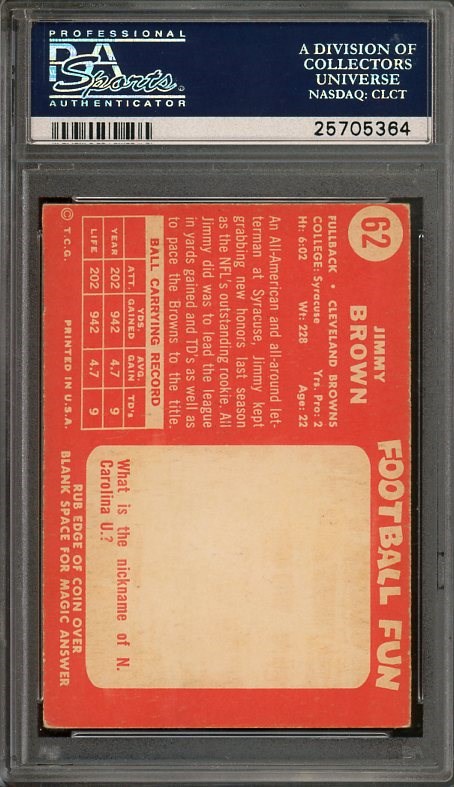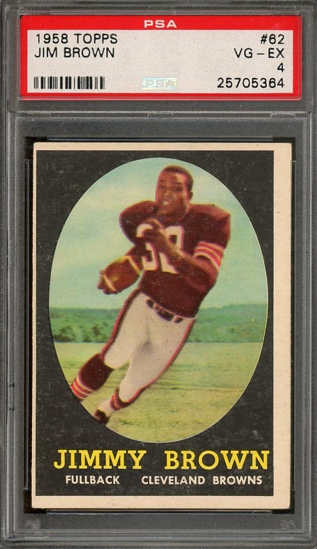 1958 Topps Jim Brown RC #62 PSA VG/EX 4 - Although the card is off-center, this PSA 4 has a cleaner look than a lot of other VG/EX examples. The image and surface is strong, with better than average corners for the grade.