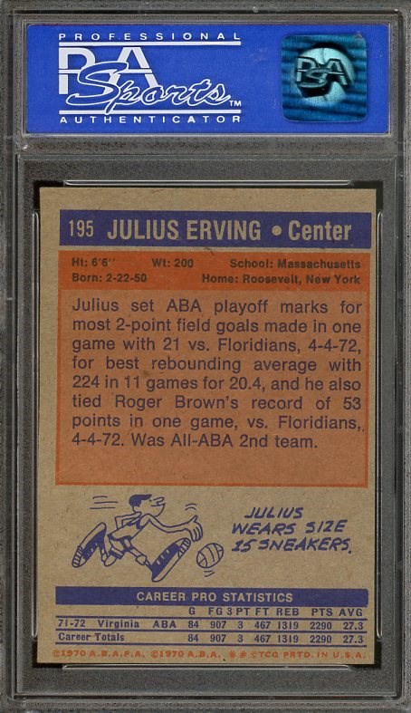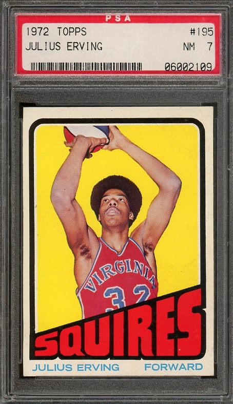 1972 Topps Julius Erving RC #195 PSA NM 7 - A solid PSA 7 that is well centered and sharp, this Dr. J rookie doe not disappoint. A must have card for any serious basketball collector.