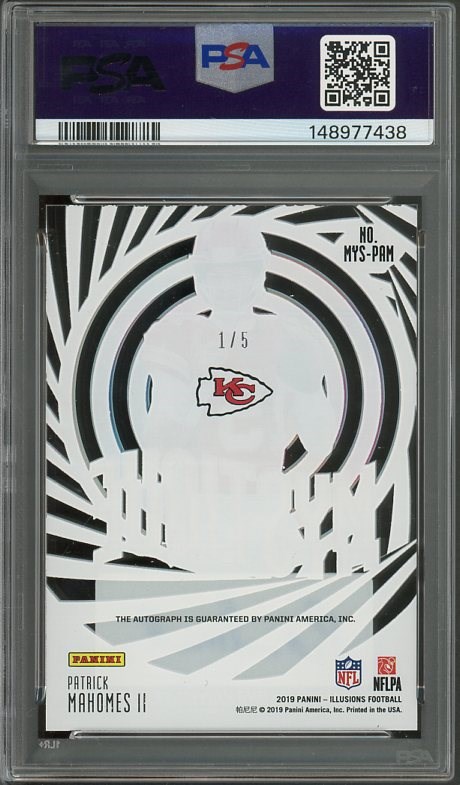 2019 Panini Illusions Patrick Mahomes Mystique Autograph #PAM (Serial #1/5) PSA 8 with PSA 10 Auto - As time passes, the early Mahomes autographs (2017-2019) are likely to become more desirable than the less detailed version he now uses.  This card is super rare with a print run of only five made!