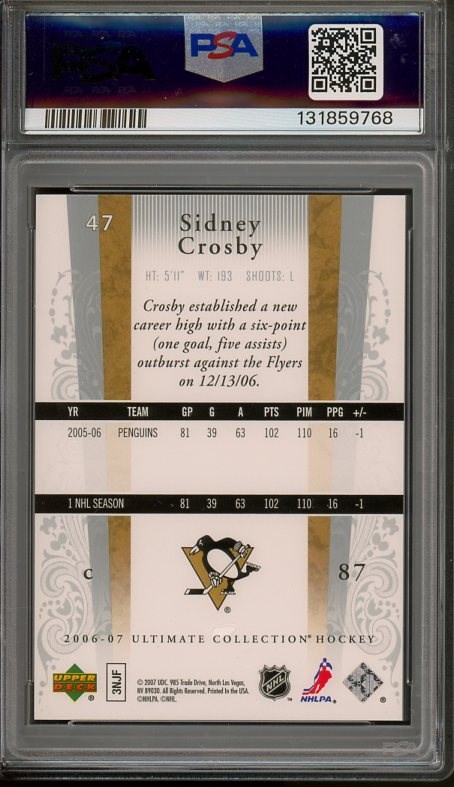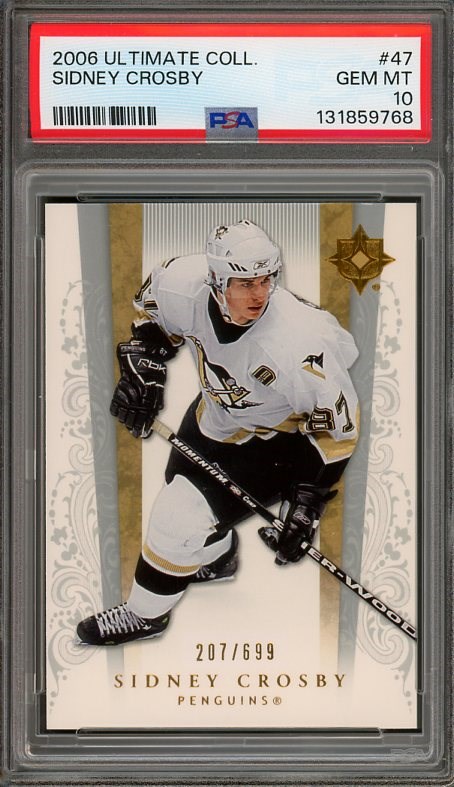 2006 Ultimate Collection Sidney Crosby #47 PSA GEM MINT 10 (Pop 9) - An attractive card of Crosby, this Ultimate Collection product was limited to 699, making it tough to put together a complete set.