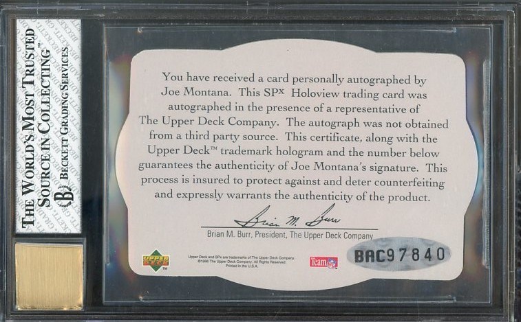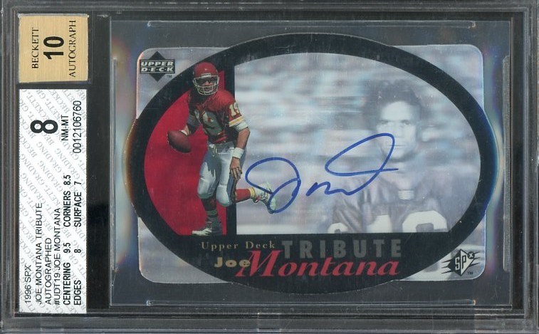 1996 SPX Joe Montana Tribute Autograph #UDT19 BGS 8 with BGS 10 Auto - From the 1996 SPX product, this Joe Montana Tribute Autograph is graded NM/MT 8 with a Gem Mint 10 autograph.