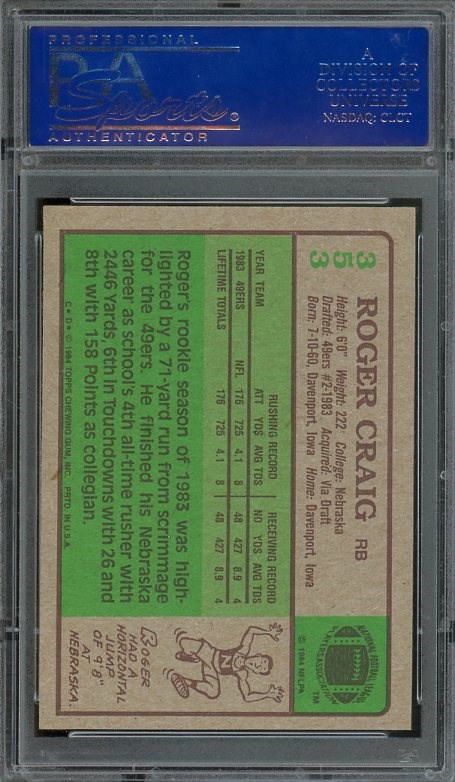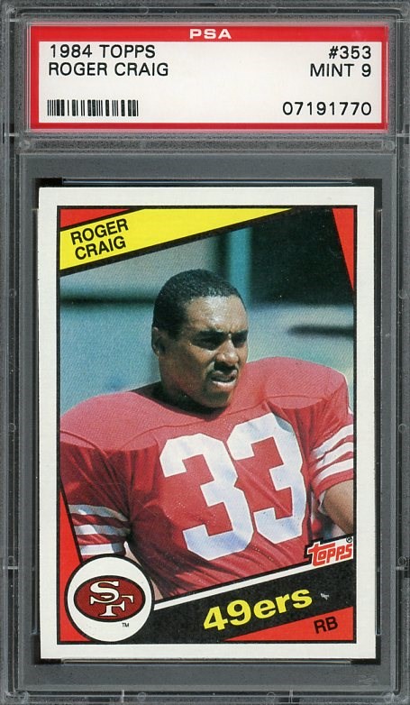 1984 Topps Roger Craig RC #353 PSA MINT 9 - A recent addition to the Hall of Fame, this Craig rookie has had great upward momentum. Here is a PSA Mint 9 to add to your HOF rookie collection.