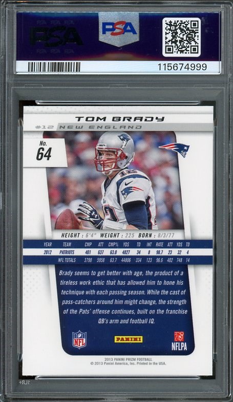 2013 Panini Prizm Tom Brady #64 PSA GEM MINT 10 - A high demand card of Brady, especially in PSA 10 grade. Card comes in a new PSA holder.