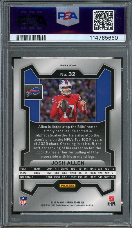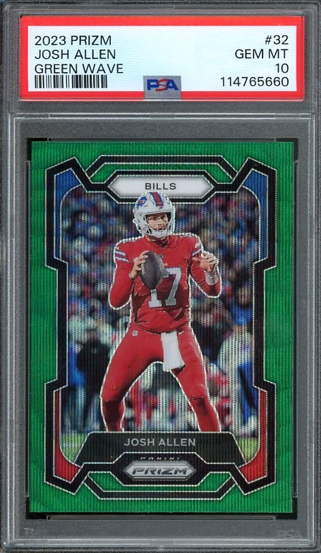 2023 Panini Prizm Josh Allen Green Wave Prizm #32 PSA GEM MINT 10 - Centered and sharp as you would expect from a PSA 10 card. Holder is scratch free. A tough and attractive Prizm parallel.