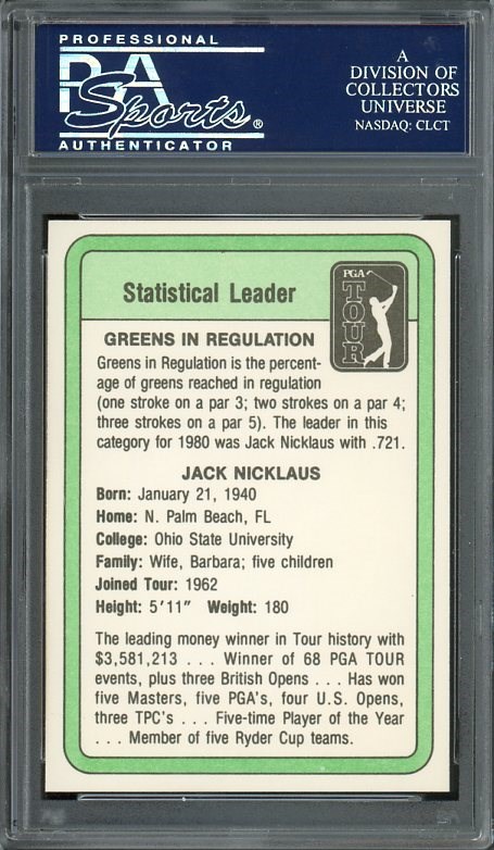 Lot # 970: 1981 Donruss Golf Jack Nicklaus Statistical Leader PSA MINT 9