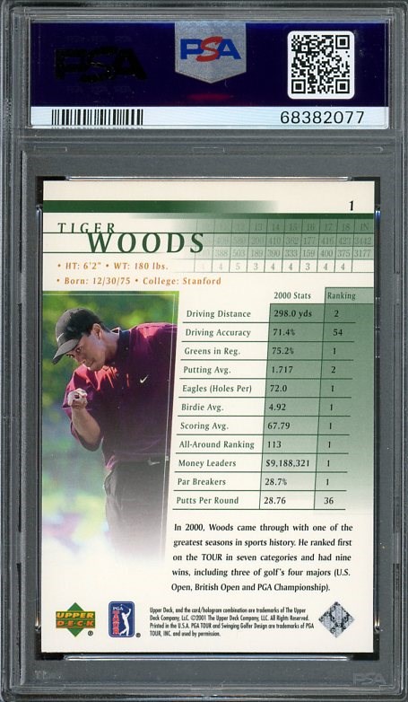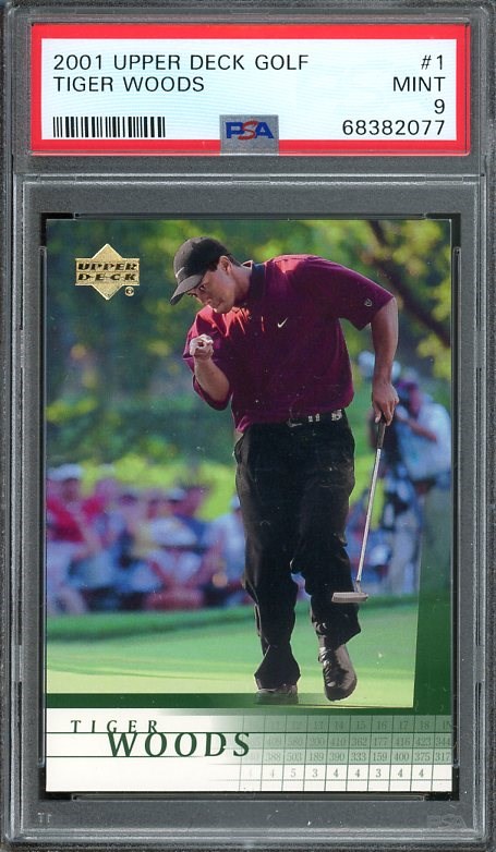 2001 Upper Deck Golf Tiger Woods RC #1 PSA MINT 9 - This famous photo used by Upper Deck, was taken on the back nine of the 2000 PGA Championship, which Tiger went on to win.
