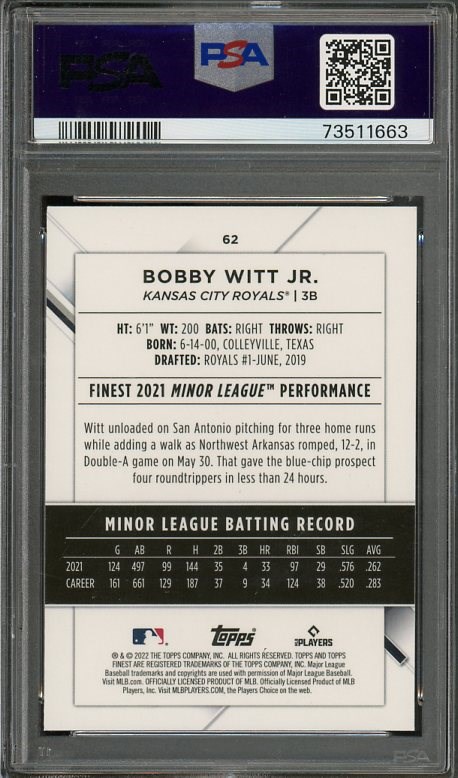 2022 Finest Bobby Witt, Jr. RC #62 PSA GEM MINT 10