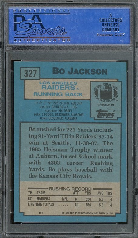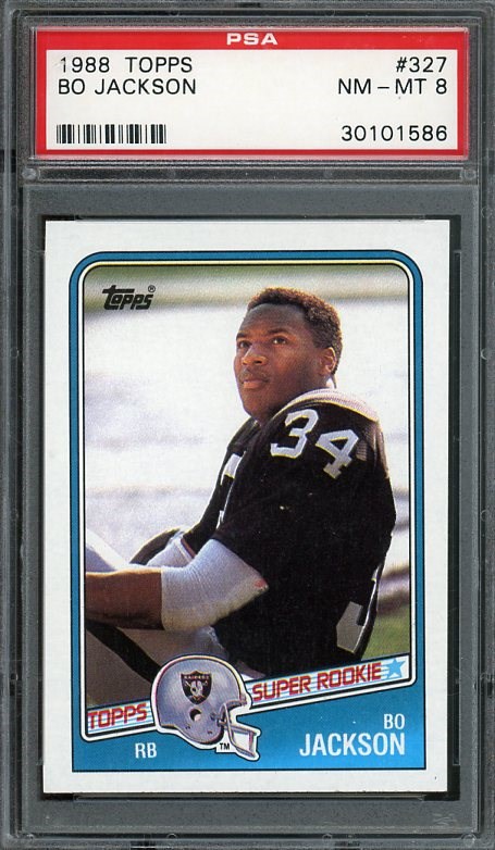1988 Topps Bo Jackson RC #327 PSA NM/MT 8 - Jackson's cards in both baseball and football have been on the rise. Here is his football rookie in PSA NM/MT 8 condition.