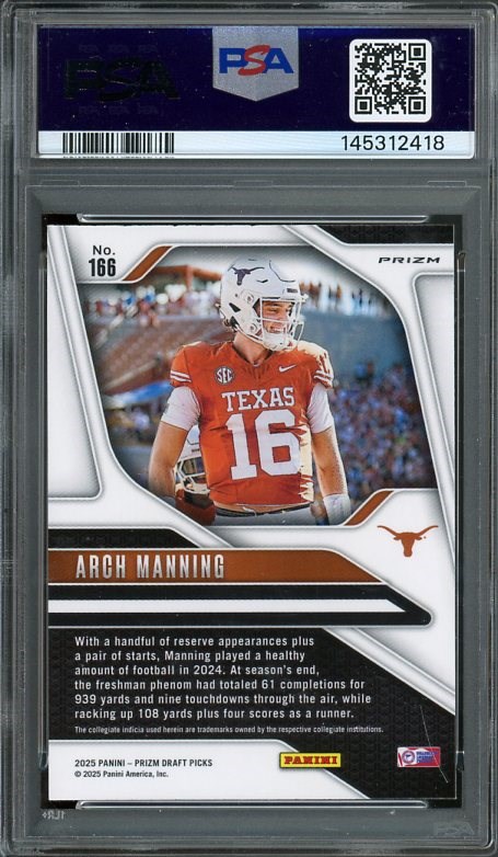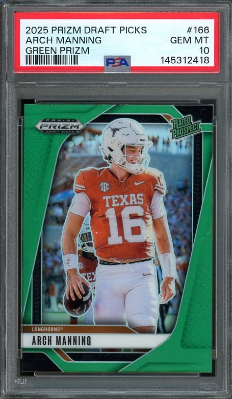 2025 Panini Prizm Draft Picks Arch Manning Green Prizm RC #166  PSA GEM MINT 10 (Pop 1)  A super hot card, this Rated Prospect card of Arch Manning is the tougher Green Prizm variation and a pop one PSA 10 as of March 2026.